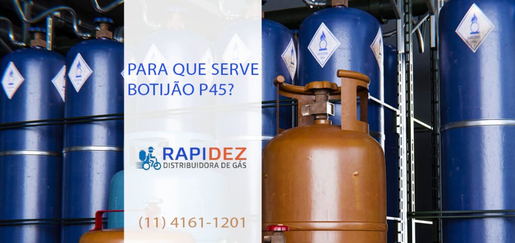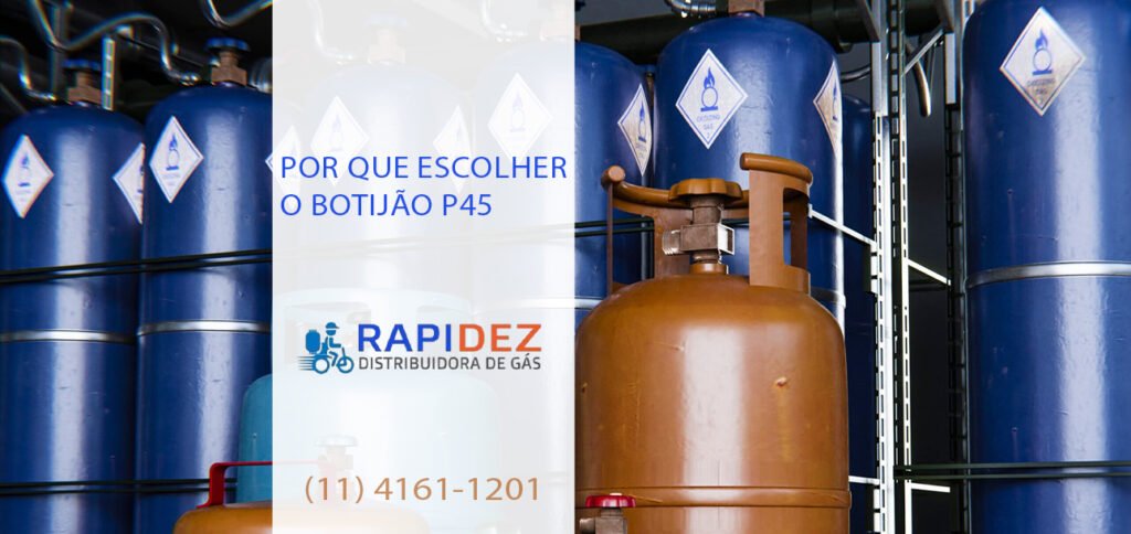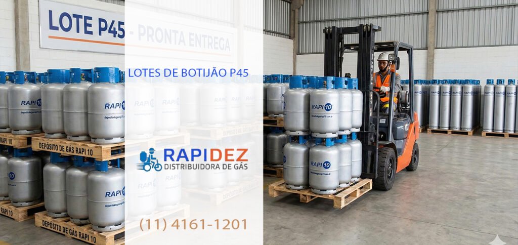 O botijão P45, com 45 kg de GLP, é ideal para uso comercial e atividades de alta demanda.